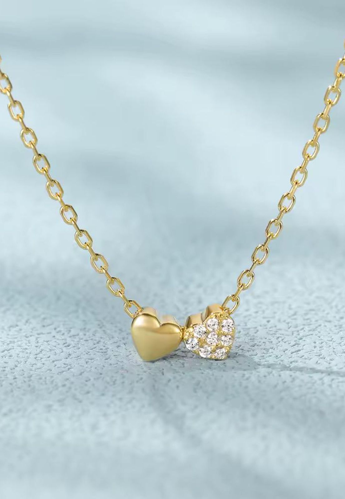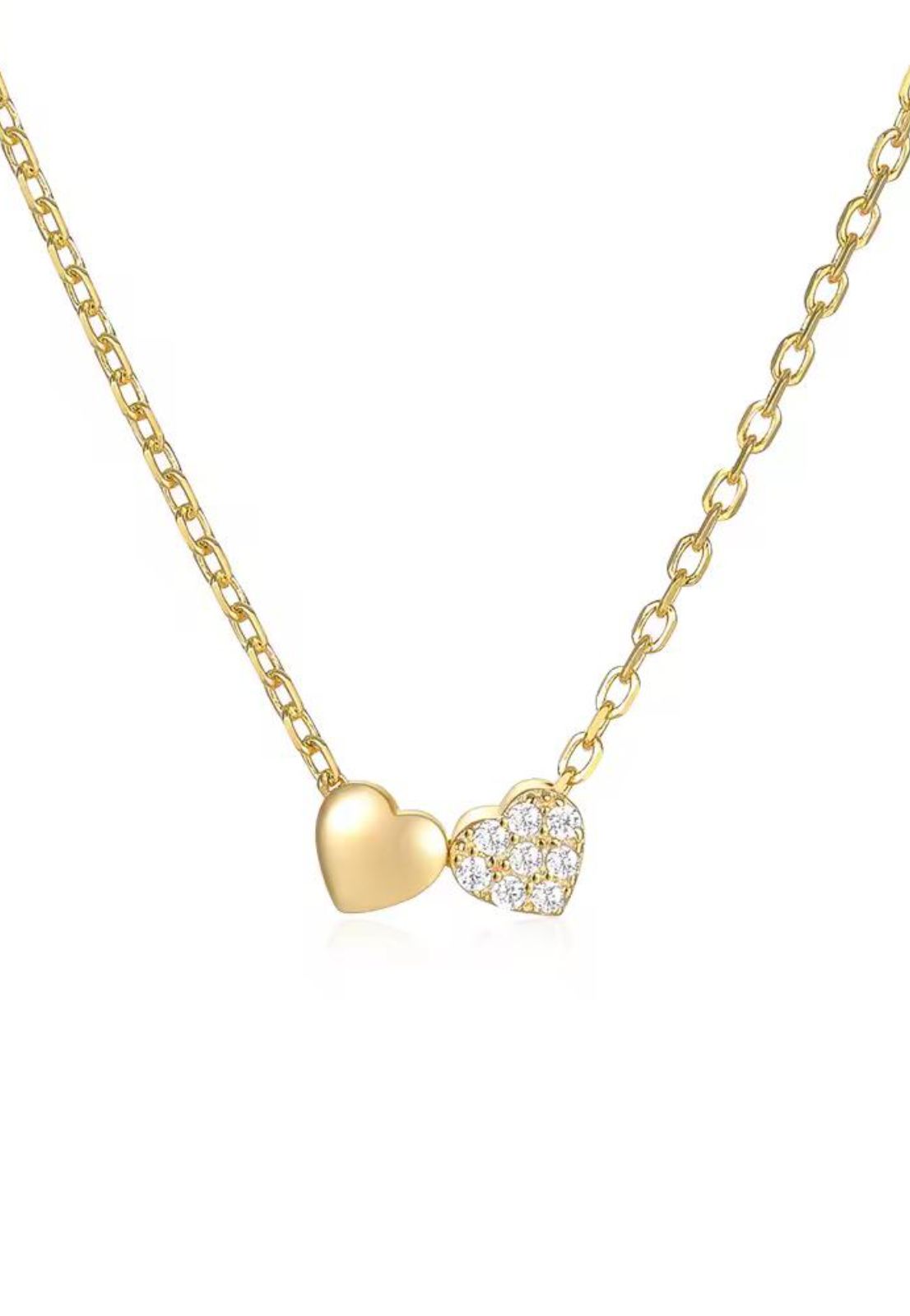 Collar de plata 925 chapada en oro 18k con diseño exclusivo de dos corazones pequeños unidos: uno liso y otro embellecido con micro cristales. Esta pieza elegante combina sofisticación y delicadeza, convirtiéndose en el complemento perfecto para cualquier ocasión. La calidad de los materiales garantiza durabilidad y brillo excepcional.